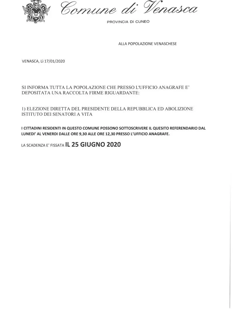 LA DATA DI CHIUSURA DELLA RACCOLTA FIRME E' FISSATA IL 25 GIUGNO 2020.