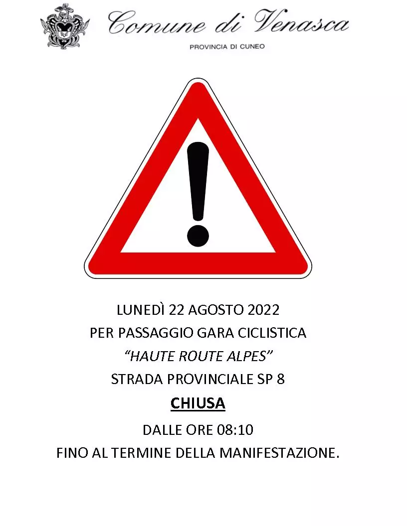 Descrizione LUNEDÌ 22 AGOSTO 2022 PER PASSAGGIO GARA CICLISTICA “HAUTE ROUTE ALPES” STRADA PROVINCIALE SP 8 CHIUSA DALLE ORE 08:10 FINO AL TERMINE DELLA MANIFESTAZIONE.