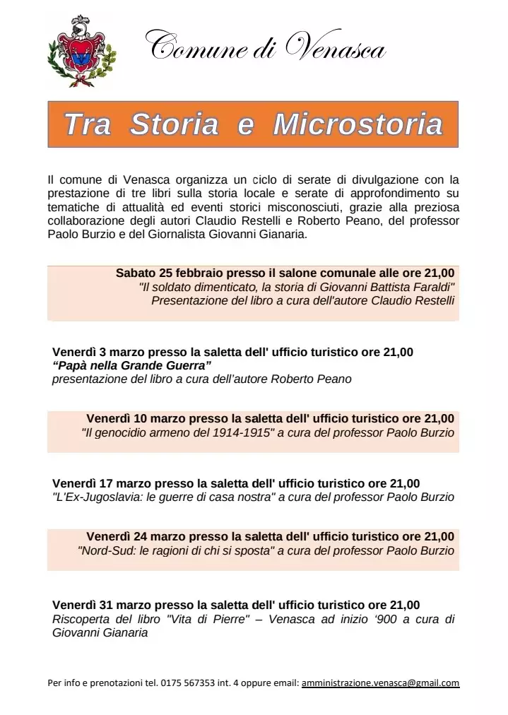 Il comune di Venasca organizza un ciclo di serate di divulgazione con la prestazione di tre libri sulla storia locale e serate di approfondimento su tematiche di attualità ed eventi storici misconosciuti, grazie alla preziosa collaborazione degli autori Claudio Restelli e Roberto Peano, del professor Paolo Burzio e del Giornalista Giovanni Gianaria.