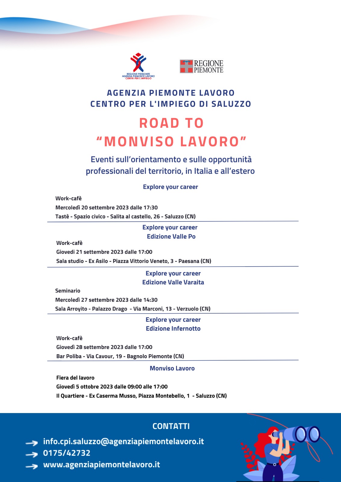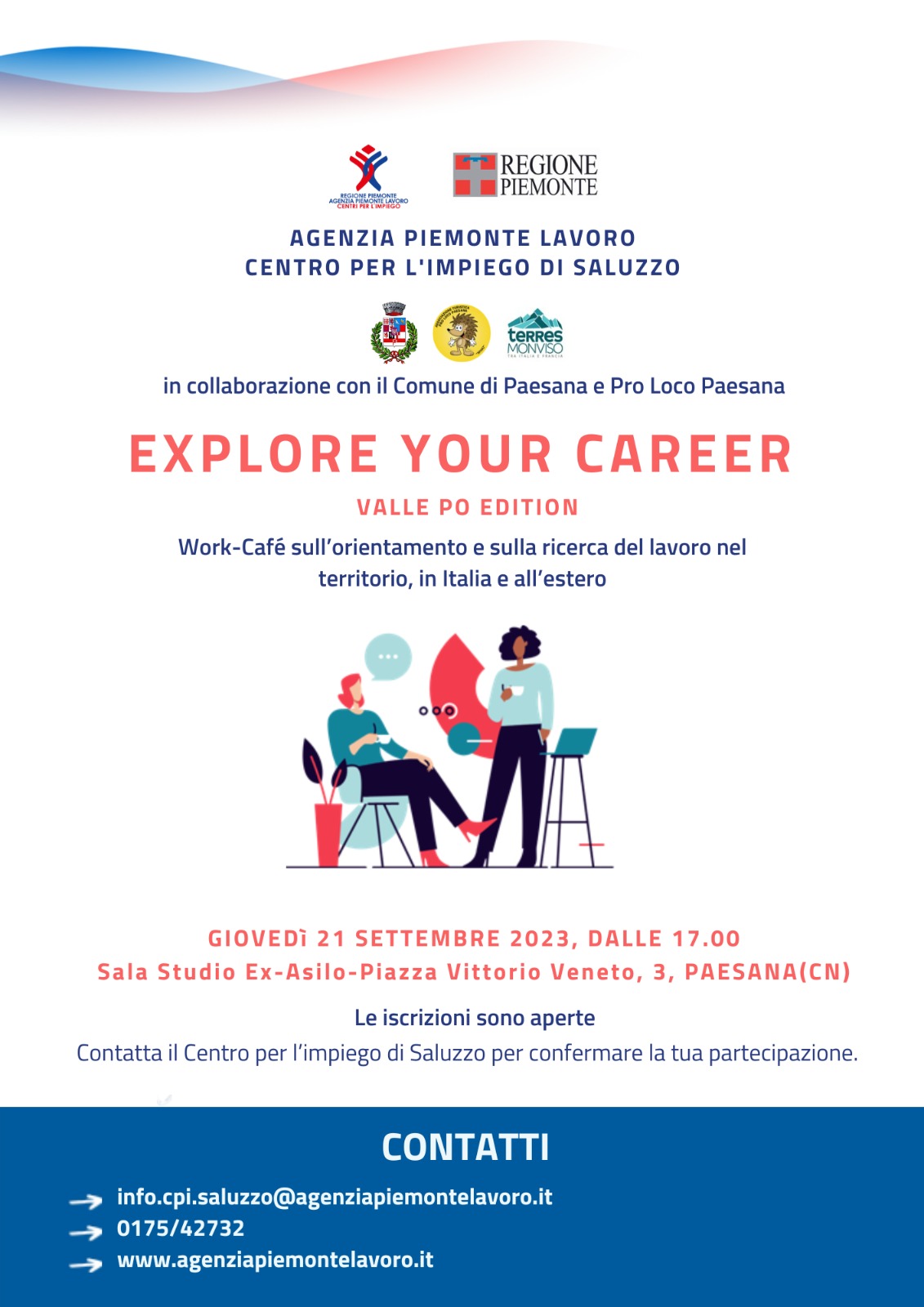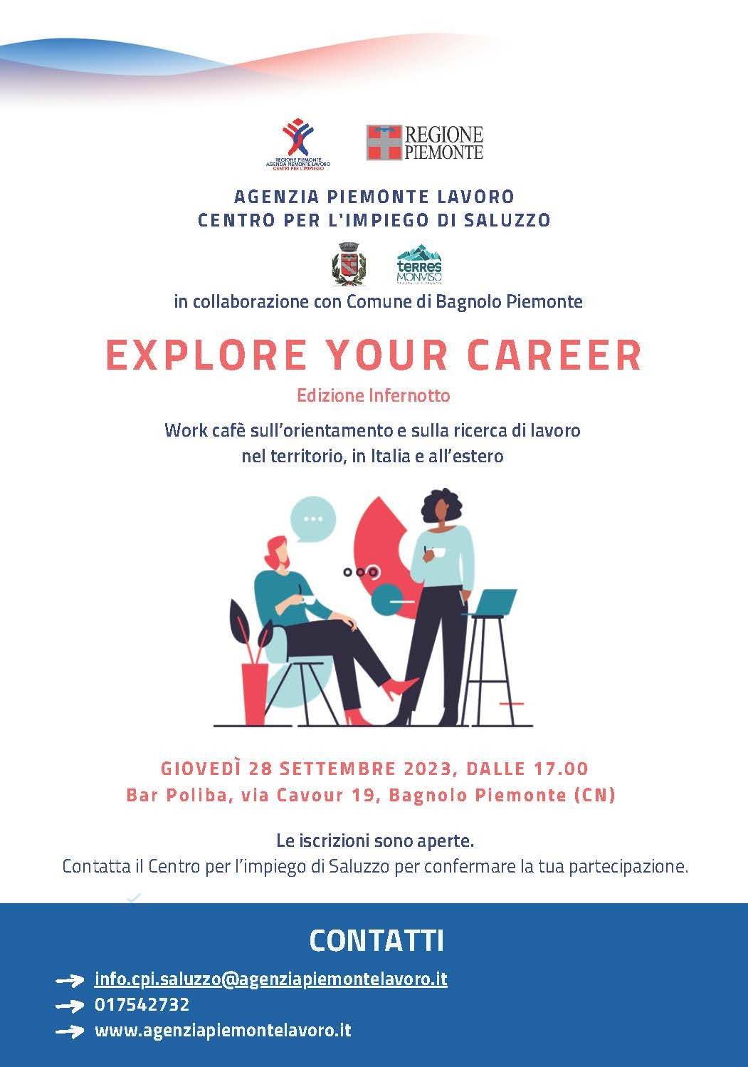 AGENZIA PIEMONTE LAVORO CENTRO PER L'IMPIEGO DI SALUZZO IN COLLABORAZIONE CON IL COMUNE DI SALUZZO "EXPLORE YOUR CAREER" WORK CAFE' SULL'ORIENTAMENTO E SULLE OPPORTUNITA' PROFESSIONI DEL TERRITORIO, IN ITALIA E ALL'ESTERO.