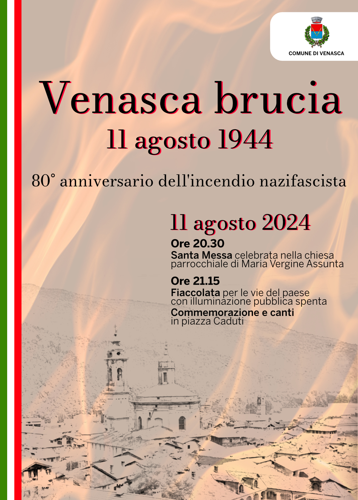 Descrizione Domenica 11 agosto 2024 a partire dalle ore 20.30 commemorazione dell'80° anniversario dell'incendio nazifascista avvenuto l'11 agosto 1944. Il programma nel manifesto allegato.