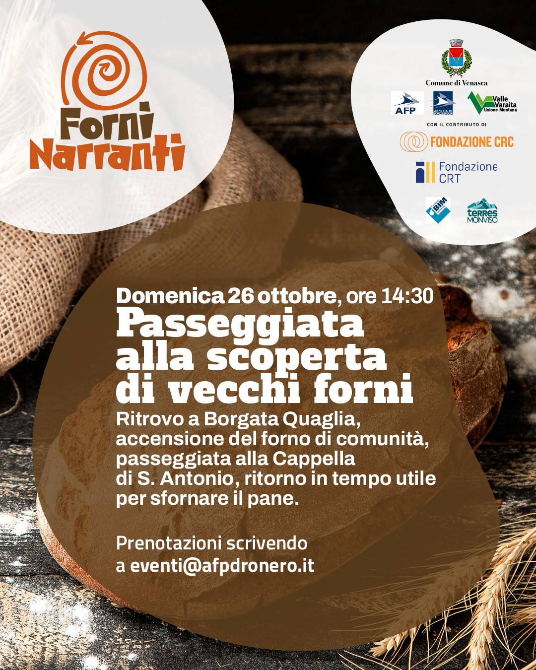 Domenica 26 ottobre alle ore 14.30 a Venasca si svolge la passeggiata alla scoperta dei vecchi forni da pane delle borgate locali, organizzata nell’ambito del Festival “Forni Narranti – Storie di pane, cultura e condivisione”. Il ritrovo è fissato in borgata Quaglia, dove verrà acceso il forno di comunità, un tempo capace di sfornare più di trenta micche. Da qui partirà la camminata fino alla cappella di Sant’Antonio; al rientro, sarà possibile assaggiare il pane cotto nel frattempo. La partecipazione è gratuita, ma è richiesta la prenotazione all’indirizzo email eventi@afpdronero.it.